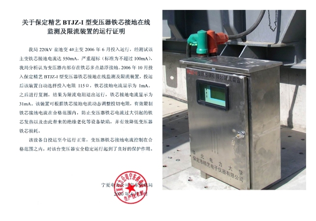 寧夏自治區(qū)鹽池220KV變電站4號(hào)主變安裝并投入運(yùn)行我公司鐵芯接地在線監(jiān)測(cè)及限流裝置